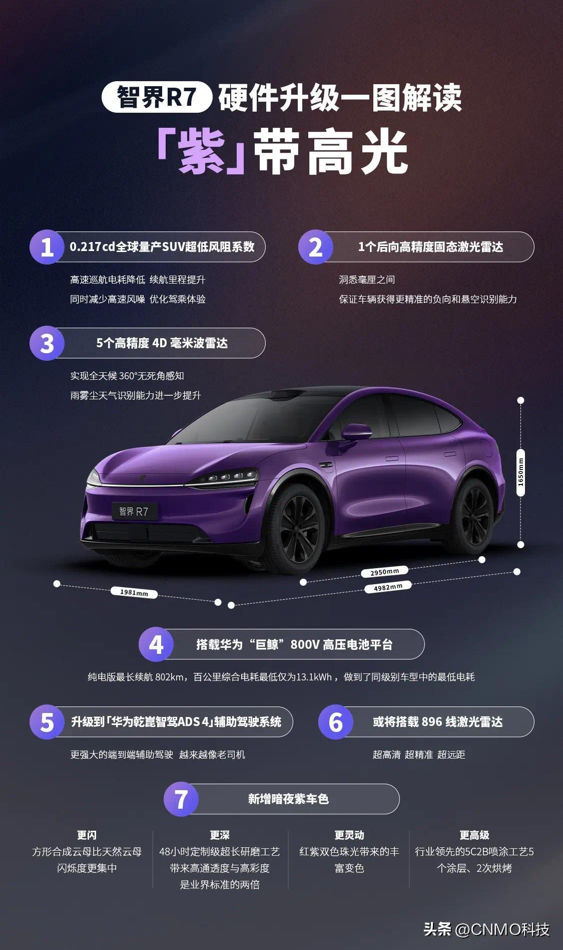近日,智界R7与智界S7推出全新车色“暗夜紫”。该配色延续极光绿同款工艺,通过上百次漆料配方与颗粒比例调试,在不同光线下呈现出由深紫到微光流转的层次变化,兼具沉稳质感与细腻光泽,强化整车的高级感与辨识度。