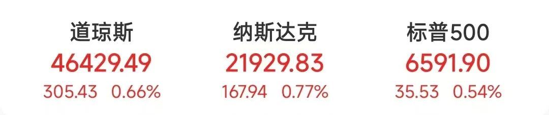 截至收盘,道指涨305.43点,涨幅为0.66%,报46429.49点;纳指涨167.94点,涨幅为0.77%,报21929.83点;标普500指数涨35.53点,涨幅为0.54%,报6591.90点。